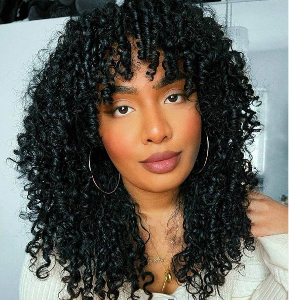 Full bangs cover your forehead and blend seamlessly with the rest of your curls. This style is perfect for those who want a bold, face-framing look.